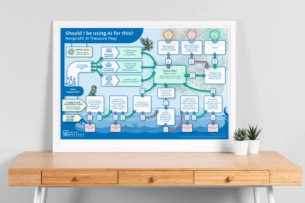 I’ve created a Nonprofit AI Treasure Map for the non-technical nonprofit leader. It’s a roadmap to help you make sensible decisions when it comes to adopting AI technology. One of my top pieces of advice is to wait and see: the technology is moving quite fast and something that makes no sense today might work pretty well in one or two years (but also might take one or two decades, if ever!).